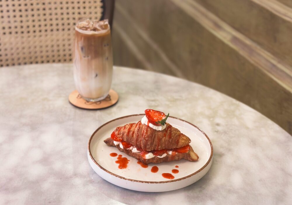サクサクのクロワッサンと甘酸っぱいイチゴ、そしてクリーミーなホイップクリームは相性抜群。一緒に注文したアイスカフェラテともよく合います。