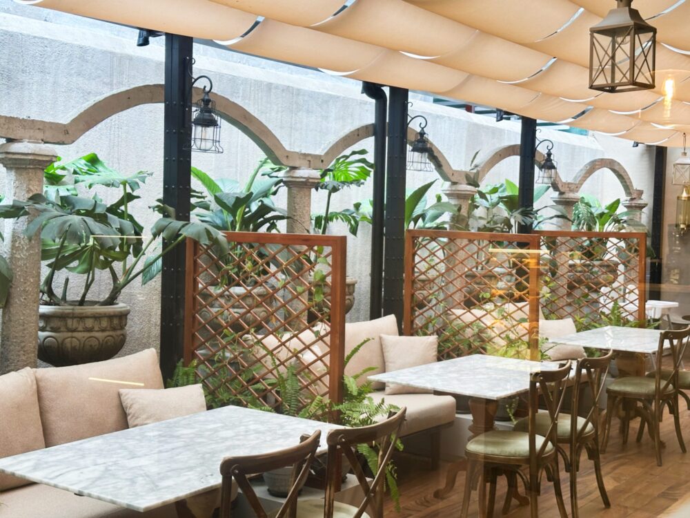 まず目を奪われるのは、テラスを彩る繊細な鉄製の装飾。クラシックな幾何学模様の向こうに見えるのは、燦々と降り注ぐ光。扉を開ける前から、心が弾みます。