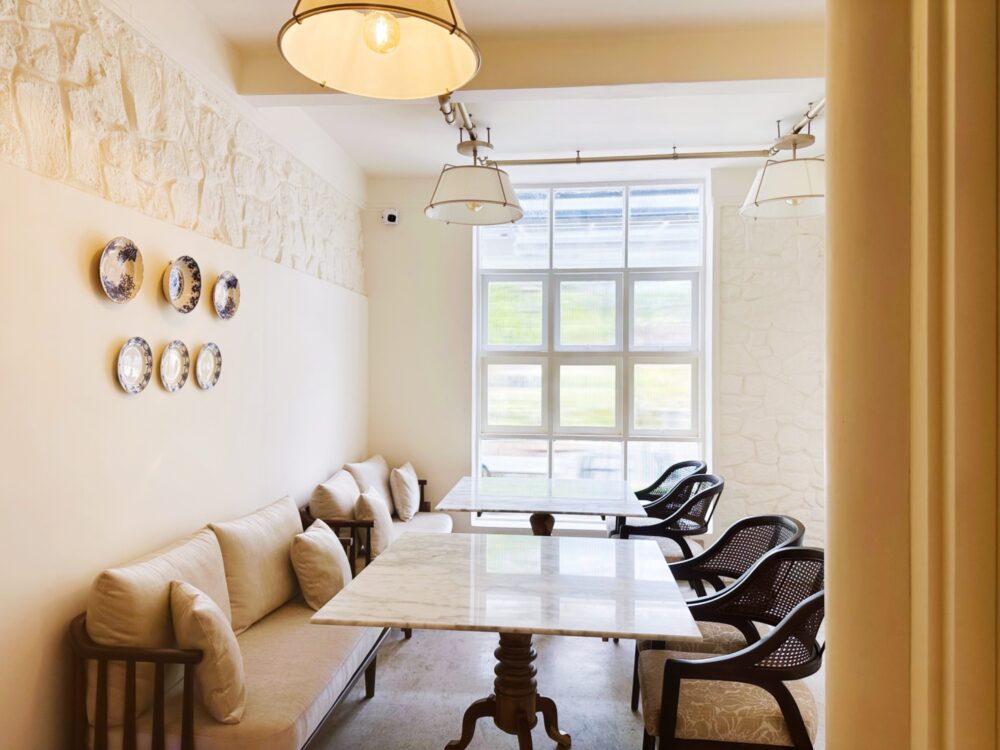 店内は、高級感のある大理石のテーブルが並ぶ、上品で落ち着いた空間。