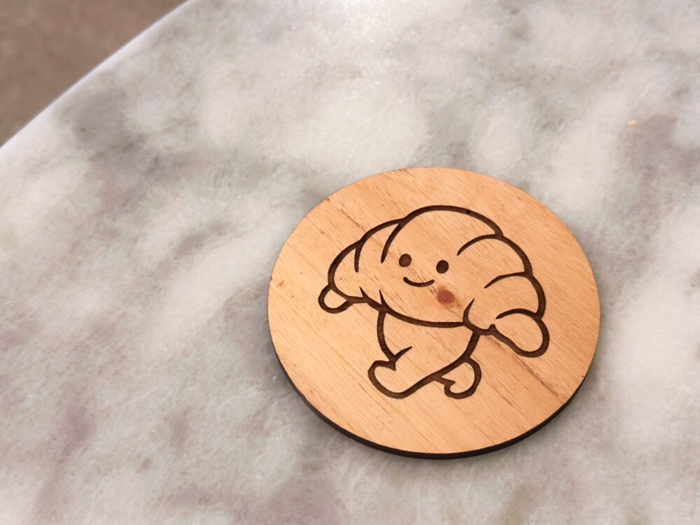 ドリンクのコースターにはクロワッサンをモチーフにしたオリジナルキャラクターが描かれていました。店内のあちこちにさりげなく登場していて、遊び心も感じられます。