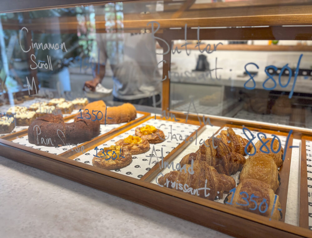 カウンターのガラスケースにクロワッサンやケーキが並びます。