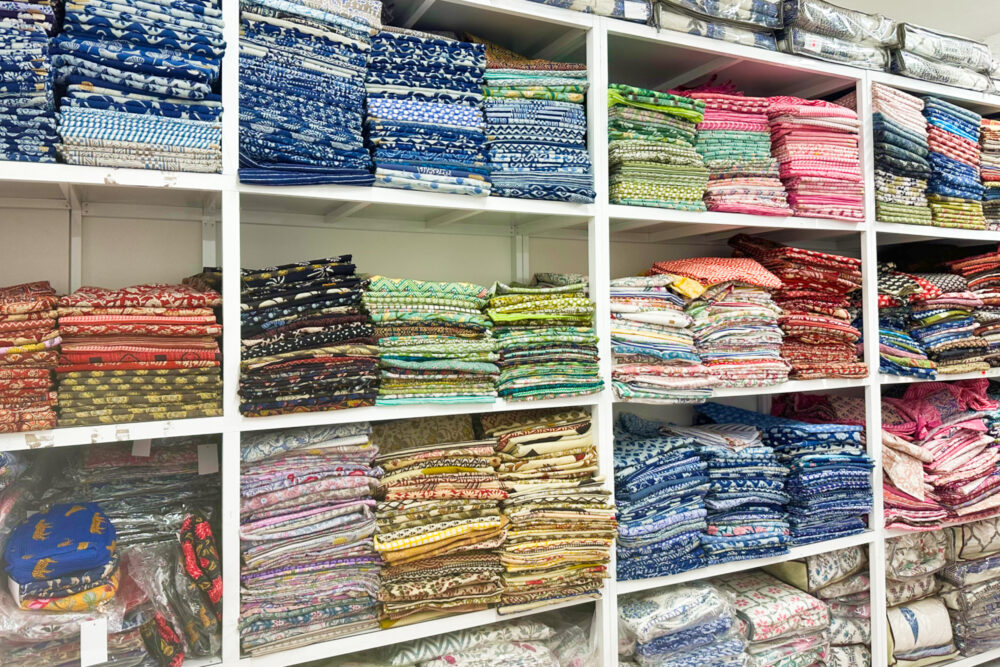 建物内や周辺には生地屋さんがたくさんあります。また、他のお店でもブロックプリントの生地を扱っているところがあるので、生地に興味のある方はいろいろなお店を見比べてみるのも楽しいかもしれません。