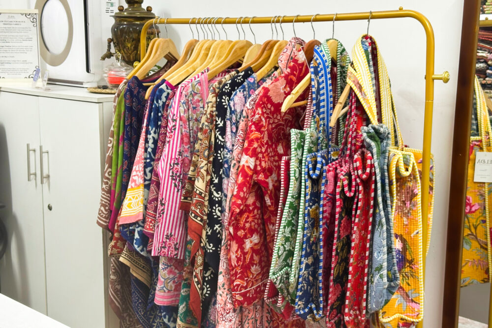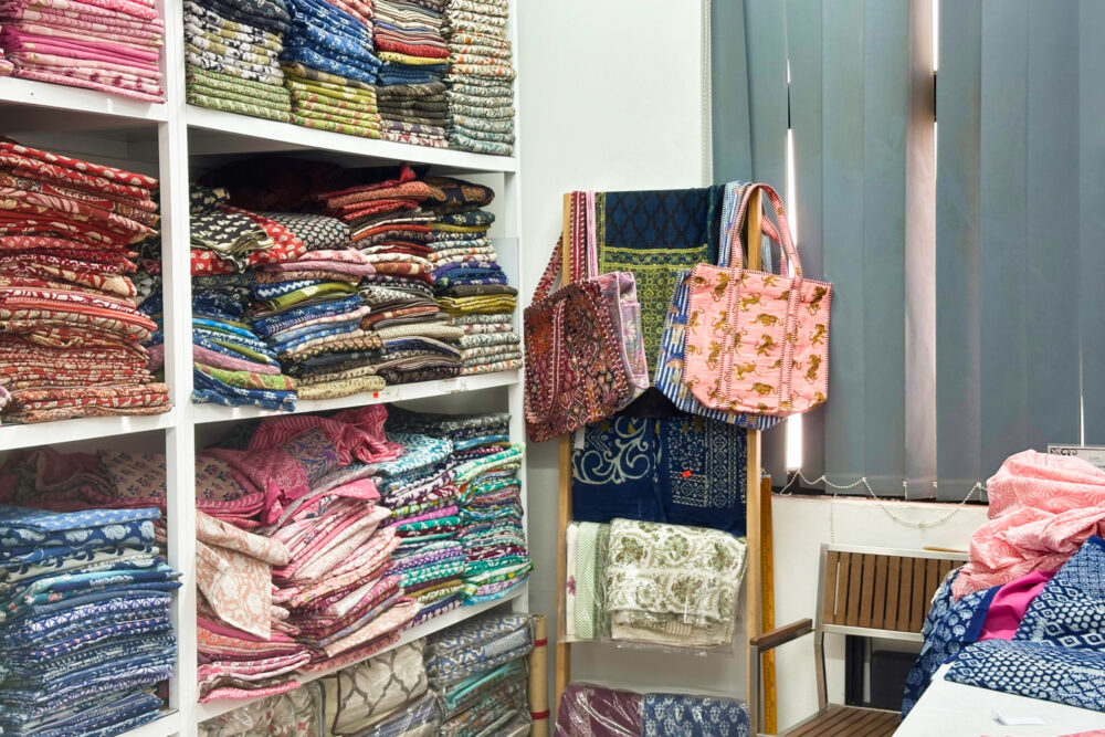 店内には、生地だけでなくブロックプリントを使った服やトートバッグも並んでいます。