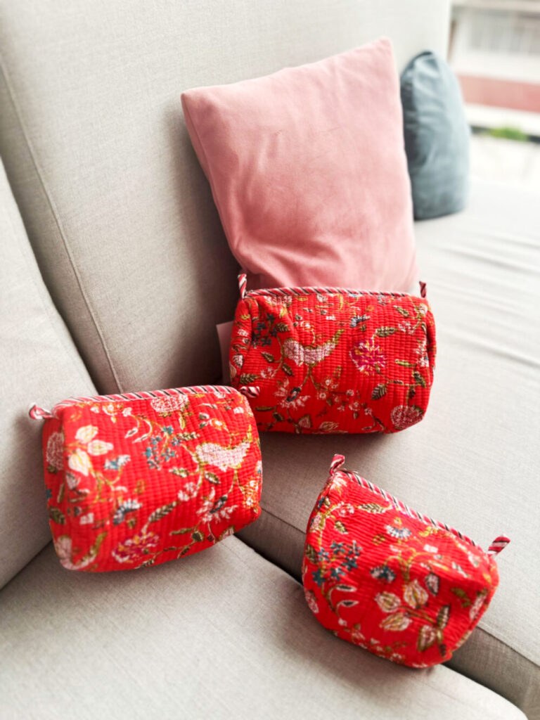 鮮やかな赤地に繊細なプリントが施されたこのポーチ。見た目の可愛さはもちろんですが、大と中のポーチには内ポケットがついているので使い勝手がよさそう。