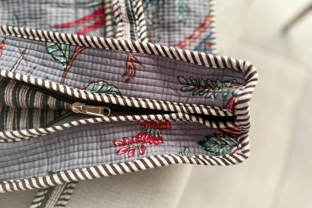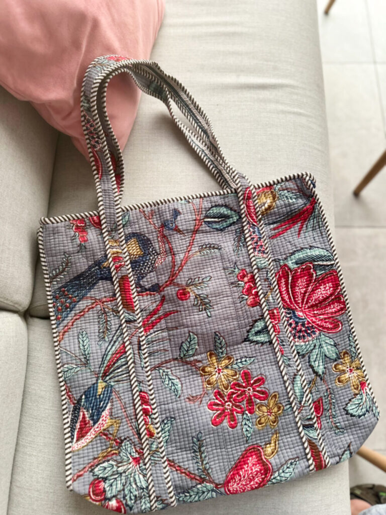 落ち着いたグレーの地色に、鮮やかな赤や黄色のお花、そして誇らしげなクジャク。伝統的なブロックプリントでありながら、どこかモダンで洗練された雰囲気も漂います。