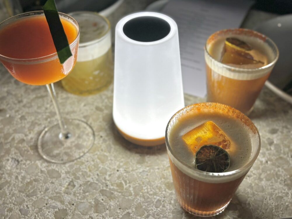 スリランカの伝統酒アラックに、黒糖のようなコクがあるキトゥルシロップとライムを合わせた一杯。 - 左手前:Arrack Carrot Ginger Lime(アラック・キャロット・ジンジャー・ライム)