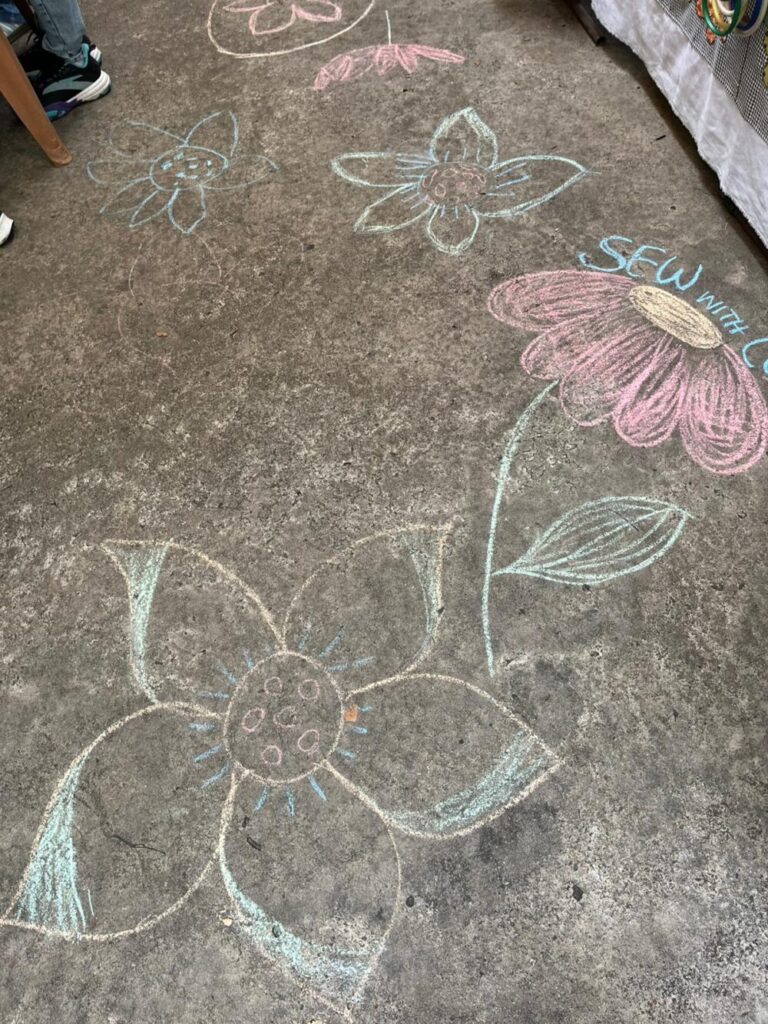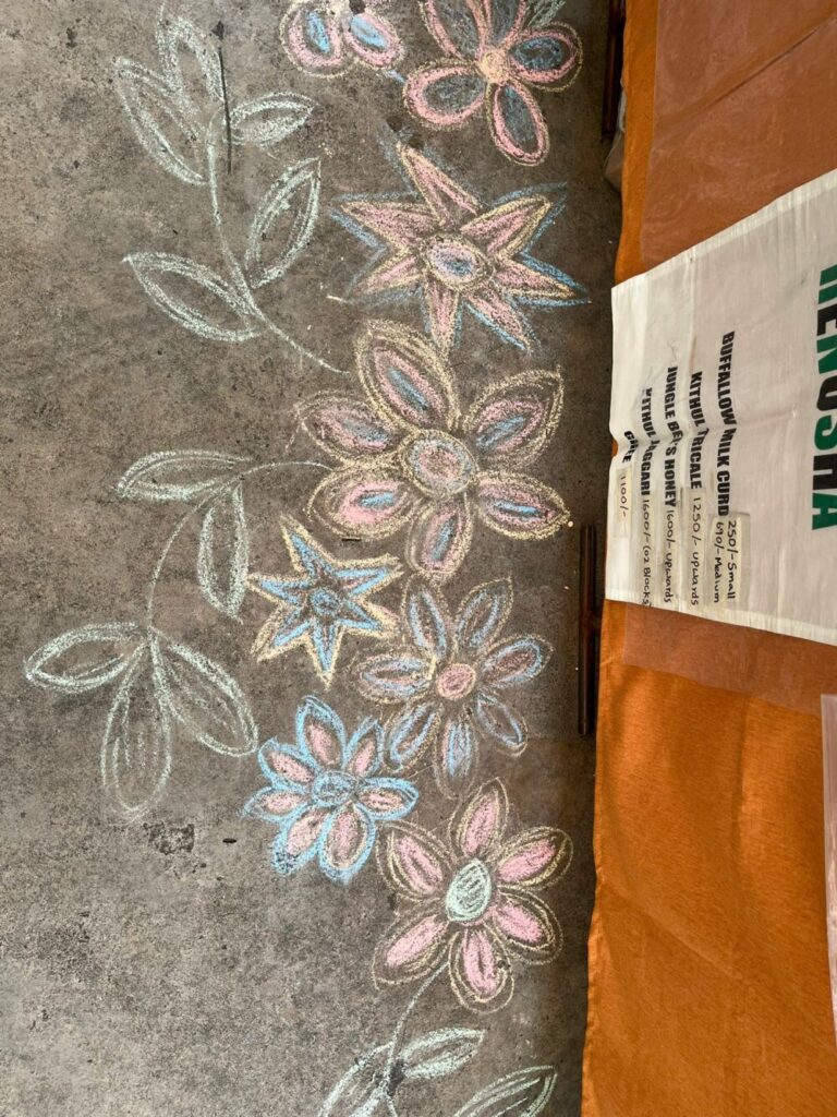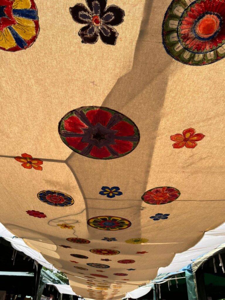 地面には子供たちが思い思いの絵を描き、通りの頭上にはカラフルな布がかかっている小道を進みながら、店を見てまわります。