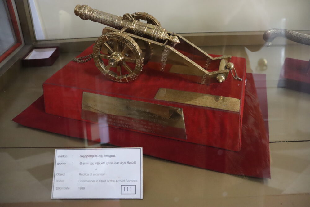 第一展示室を入ってすぐ右側には、1980年にスリランカ陸軍司令官からジャヤワルダナ氏に贈られた金の大砲のレプリカが展示されています。リューケ・ディサーウェ(キャンディ王国時代の州知事)がキャンディの王スリ・ウィジャヤ・ラジャシンハ(1737-1747年)に献上した大砲のレプリカであると言われています。リューケ・ディサーウェは、キャンディ王国における州知事のような存在であったディッサーヴァの役職についていた人物です。当時、キャンディ王国には21の州があり、そのうちの12の大きな州のトップがディッサーヴァだったそうです。