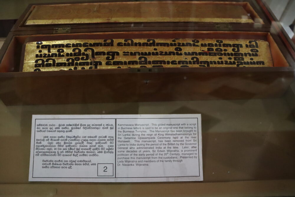 ビルマ語で書かれた写本。キャンディ国王ウィマラダルマスーリヤ2世の治世(1687-1707年)に、マハウェリ川で開催されたゲタベ・ウパサンパダ(上座部仏教の出家式)を記念するものです。イギリス占領時代にインドに持ち出されましたが、F・R・セーナーナーヤカ氏(セイロン初代首相の兄)が購入し、レディ・ウィジェラトナとその家族によって、N・ウィジェラトナ博士を通して寄贈されました。