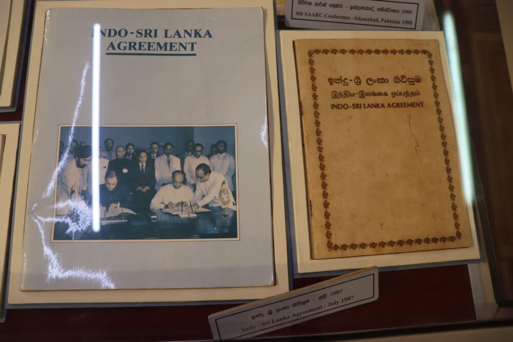 1987年7月29日にコロンボでインド首相ラジーブ・ガンディーとスリランカの大統領J.R.ジャヤワルダナとの間で著名された協定の写真。これを受けて、JVPが第二回目の武装蜂起を行い、ミリッサのジャヤワルダナ別荘は燃やされ、その後に孫のプラディープ氏がジェフリーバワに依頼して建てたのがプラディープ・ジャヤワルダナ邸(Red Cliffs Mirissa)です。