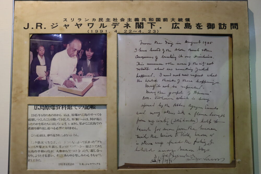 東広島にある石鎚山真言宗『蓮臺山龍玄院』の田中龍玄氏は、政界を引退したジャヤワルダナ氏を1991年に広島に招いています。龍玄による贈り物や、広島訪問時の写真が展示されています。