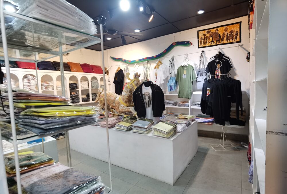 Tシャツを中心に、スリランカのモチーフが描かれた服が並びます。シンプルで着やすいデザインが多く、日常使いにもぴったり。