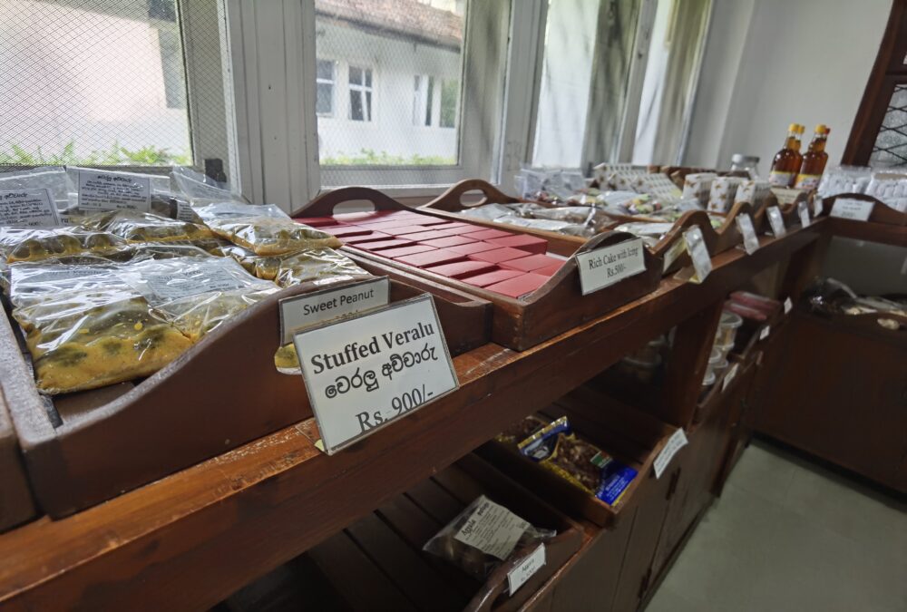 通路を渡った先には、食品コーナーがあります。缶詰のサンボルやジャム、トフィーやパウンドケーキなどのお菓子も豊富に揃っており、おやつタイムにもぴったりです。