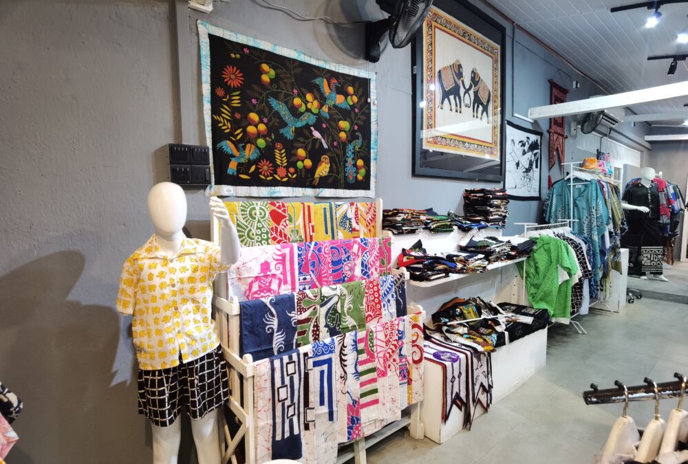 右手のスペースには、バティックやワンピースなどの洋服がずらり。スリランカのデザイナーによる独自のデザインは、お土産にもおすすめです。