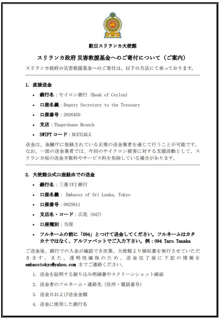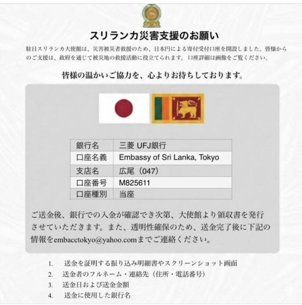 駐日スリランカ大使館「スリランカ政府災害救援基金」