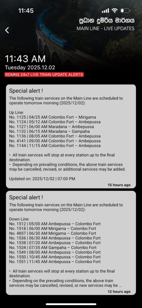 11月27日からナーヌオヤ(ヌワラエリヤ郊外)~バドゥッラ間は運休。