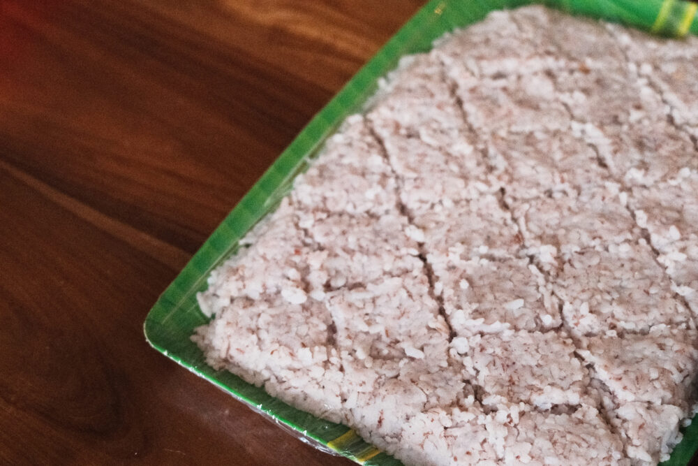 ココナッツミルクで炊いたもちっとしたごはんで、切り分けて食べるのがスリランカ流。