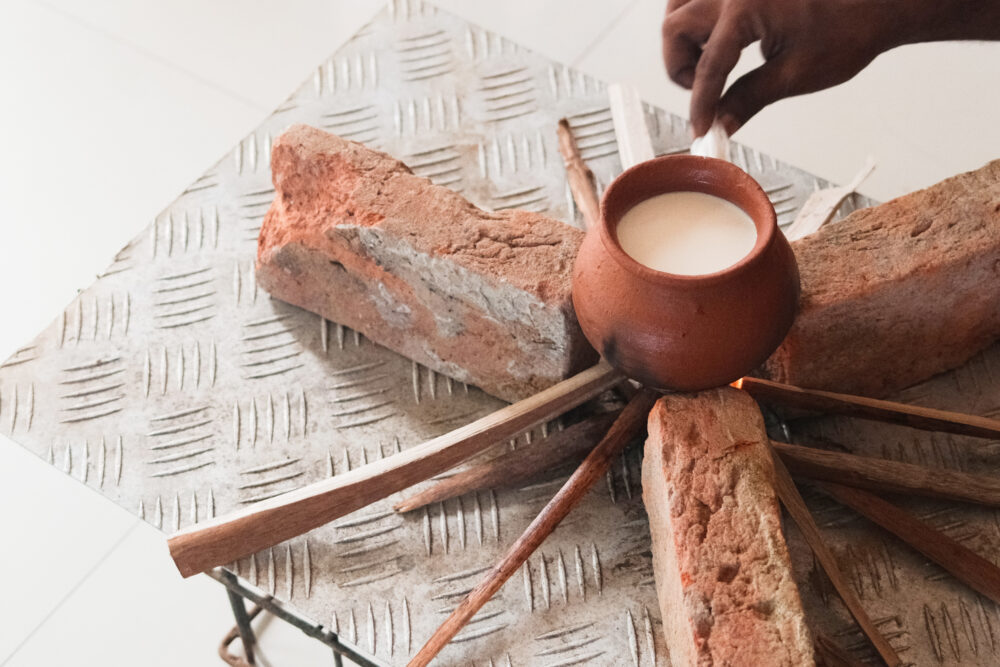 薪からパチパチと火が上がり、真っ白なココナッツミルクが温まってくると、しだいに表面が波打ち始めます。