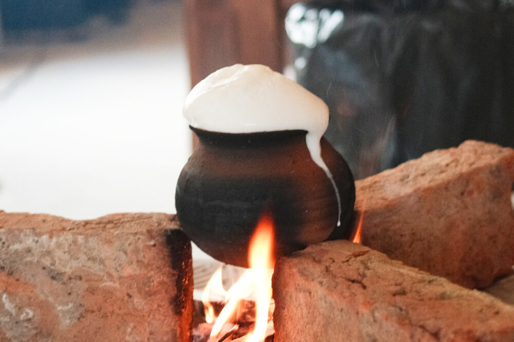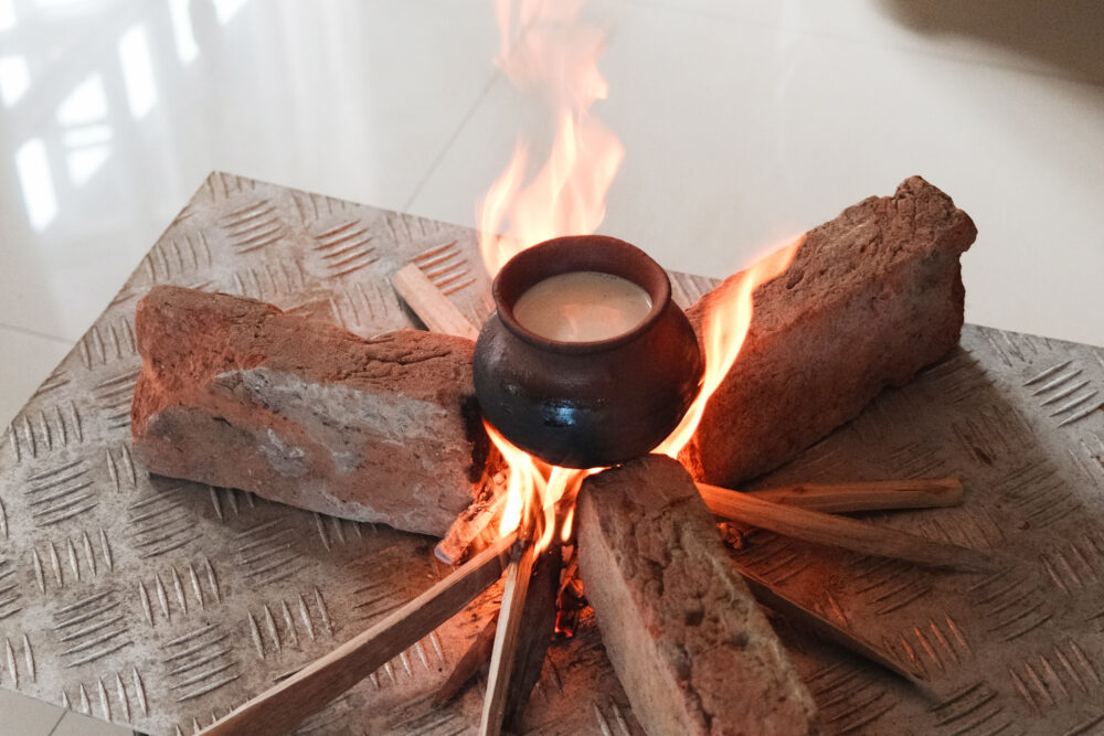 新年最初の料理を始める時間。2026年は赤い衣装を着て、南向きで行うのが縁起がよいとされていました。ここでミルクを焚き、鍋からうまく吹きこぼれると、その年は豊かな一年になると言い伝えられています。
