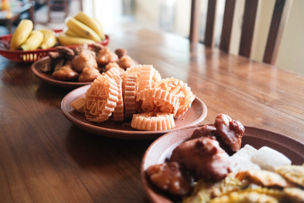 一緒に並ぶのは、花の形がかわいらしい揚げ菓子「コキス」や、甘い伝統菓子「キャウン」。どれも手が込んでいて、お母さんたちが何日も前から準備するとのこと。