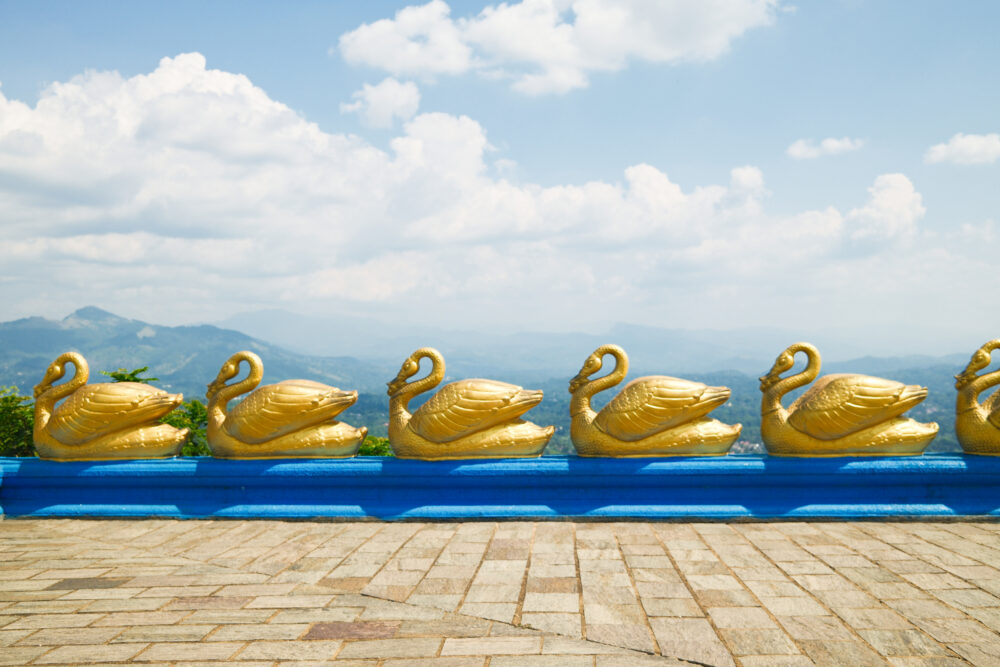 更に進むと、真っ白い仏塔が。そして、純白の仏塔の周りをぐるりと囲む金色の白鳥の像たち。