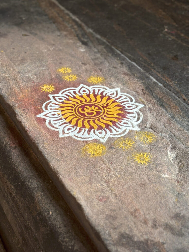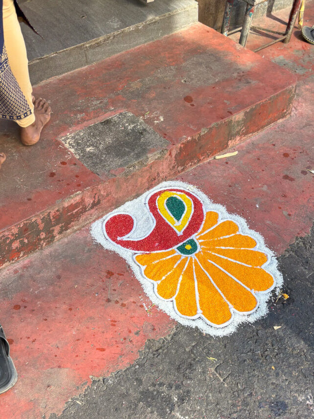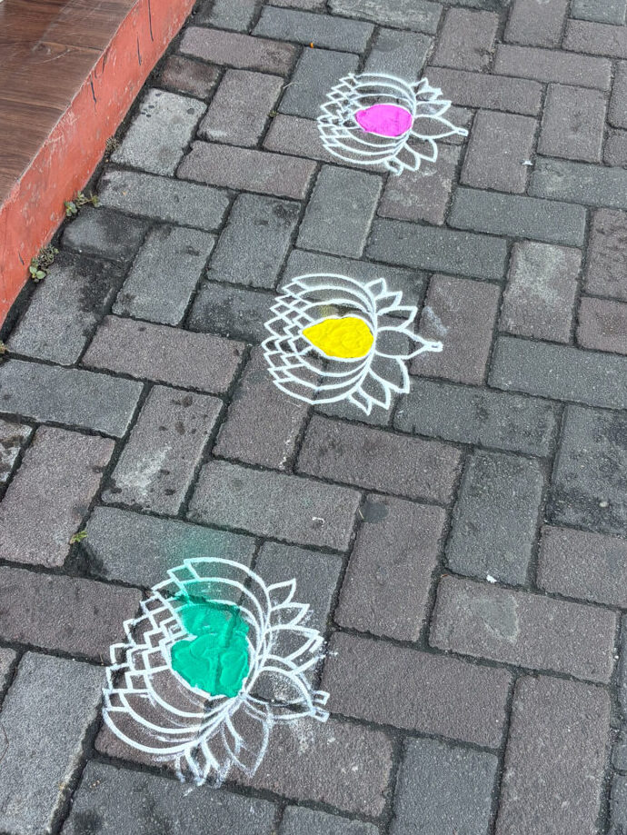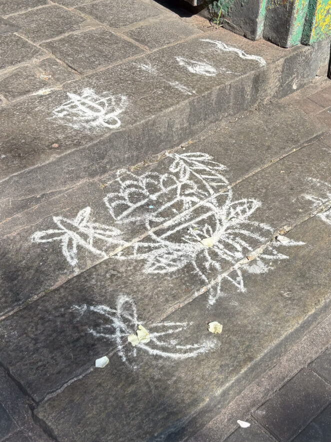家・寺院・お店の玄関口などに、とてもカラフルな模様が、女性たちによって描かれます。