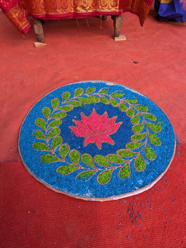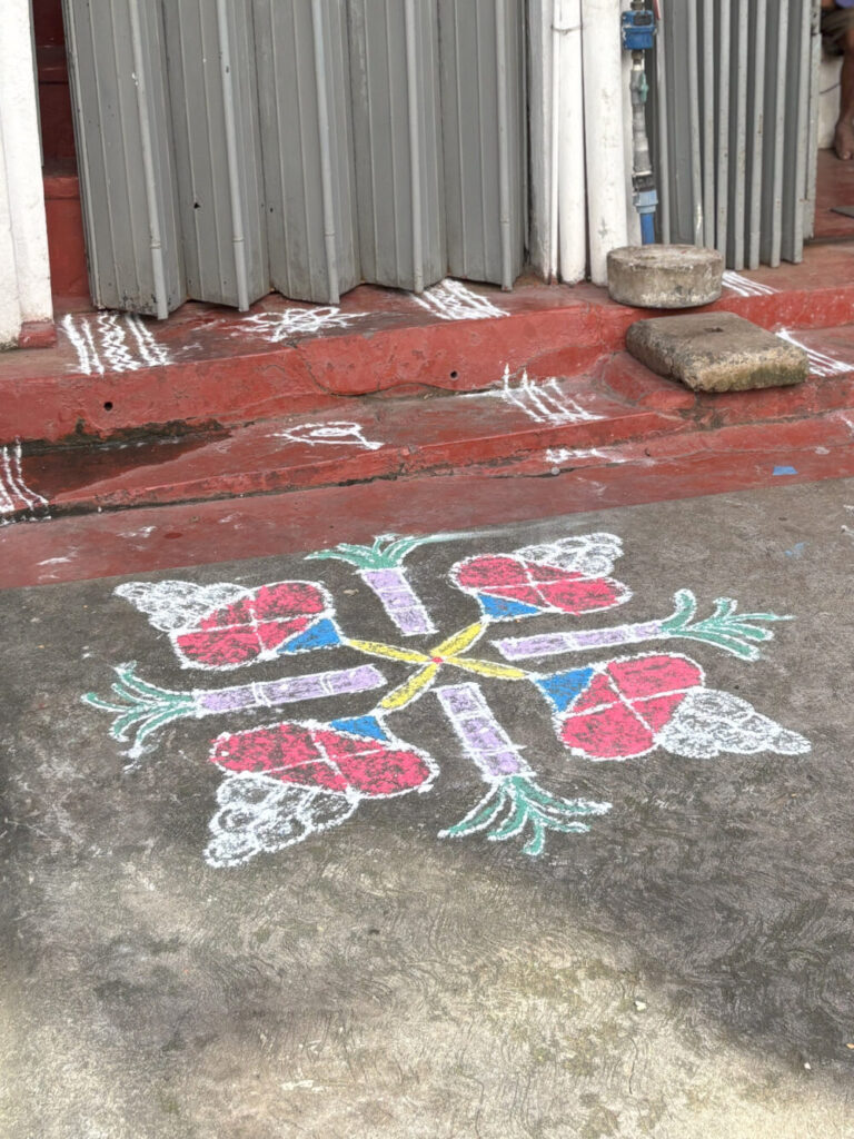 かつては、女性の花嫁修行の一つだったそうで、伝統が根強い地域では、毎朝、家の玄関口に女性がコーラムを描いています。