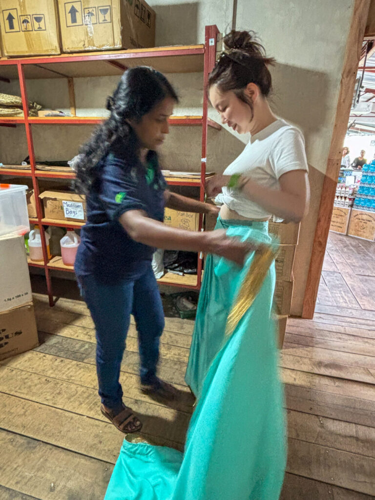 オプションのサリーレンタルをする場合は、レジ奥に吊ってあるサリーから1枚選び、ツアー前に自分の着ている洋服の上から着付てもらいます。